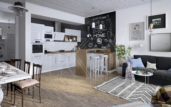 Так или иначе, белая кухня в скандинавском стиле тяготеет к сельской местности. Поэтому она предполагает использование преимущественно натуральных материалов, таких как массив дерева, хлопок, лен, овечья шерсть. Допустимо применять декоративные элементы из металла или стекла.