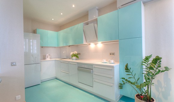 В разных оттенках выпускают синие кухни. При этом более темные подходят для просторных помещений, в которые попадает большое количество солнца. Для комнат со скудным освещением стоит выбрать модель со светло-синими шкафами.