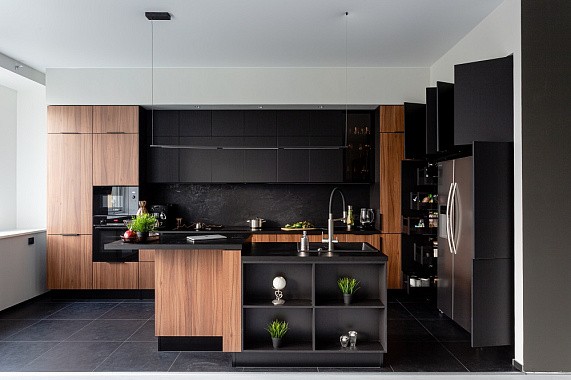 Студийные планировки предполагают открытое пространство, где кухня плавно переходит в гостиную. Здесь важно объединить стиль, подобрать одинаковые материалы для фасадов и столешниц, чтобы пространство выглядело гармонично.