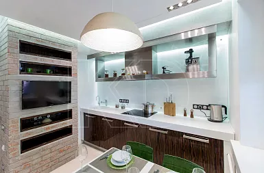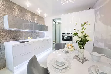 Самый эстетичный материал – натуральный камень, например, гранит или мрамор. Он очень красив, благородно смотрится и служит десятками лет. Поэтому купить кухню со столешницей из камня будет хорошим решением. Однако нужно учитывать, что такой материал хрупок и может образовывать сколы при сильных ударах. Искусственный камень такими минусами не обладает. По внешнему виду он ничем не отличается от натурального, но гораздо более долговечен и устойчив к механическим повреждениям и агрессивным чистящим средствам.