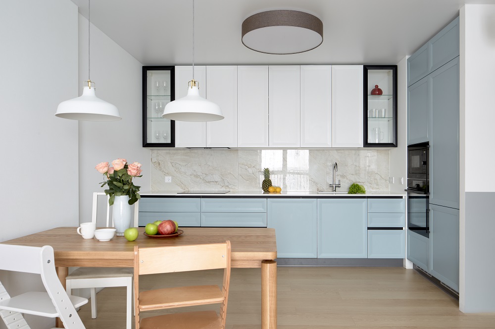 Один из главных – мода на нежное, и вместе с тем, эффектное сочетание оттенков. В этой «Патриции» прекрасно скомбинированы белый и голубой цвета. А подчёркнута эта небесная палитра грамотным добавлением чёрных акцентов. Вы наблюдаете их в технике, а также в алюминиевых рамках застеклённых зон и в ручках-профилях системы открывания «Спейс Лайн». Система «Спейс Лайн, к слову, не только придаёт гарнитуру выразительности, но и визуально «приподнимает» столешницу, делая её изящной и утончённой.