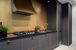 Места на кухне должно быть много, особенно, если эта кухня находится в загородном доме! Но можно ли создать интерьеры, где большая семья будет с одинаковым комфортом готовить, есть и отдыхать? «Дачный ответ» говорит – «можно»! А «Кухонный Двор» показывает, как!Мы сотворили кухню, соединившую в себе элегантность, функциональность и нестандартные дизайнерские решения. За основу была взята уже полюбившаяся всем новинка, «Ханна Стил». Ее бархатистые фасады «Extra Touch Matt» с контрастными золотыми кромками великолепно смотрятся в просторном помещении! Красота «Ханны» неоспорима, равно как и удобство. В этом проекте дизайнеры «KD-Lab» сделали ставку на строгую, симметричную архитектуру. В центре композиции – уникальная вытяжка нестандартной формы, которая выводит «Ханну» в эпицентр всеобщего внимания. Кстати, цвет вытяжки, фартука, ручек и смесителя перекликается с цветом кромок, благодаря чему облик модели выглядит цельным и завершенным.