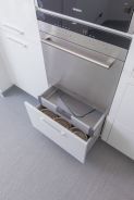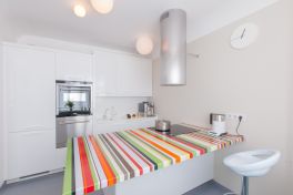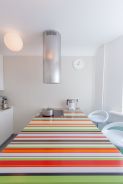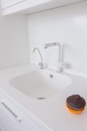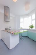 Дизайнер распланировала кухню таким образом, чтобы все было под рукой и готовить можно было, не сходя с места. Поэтому расположение мебели здесь довольно непривычное для типовых квартир – параллельное с полуостровом.Корпуса шкафов изготовлены из ламинированной ДСП белого цвета, а фасады – из покрытой белой экологичной эмалью МДФ. Вся рабочая зона кухни накрыта столешницей из искусственного камня Montelli белого цвета с небольшими вкраплениями «снежинок» – белых камушков. За счет такой пестрой расцветки удалось визуально скрыть места стыков полотен столешницы. Интегрированная бесшовная мойка сделана из того же материала. Такая конструкция очень удобна, поскольку ее легко чистить, а грязь не забивается в стыки. Мебельные секции, установленные вдоль стены, в первую очередь предназначались для установки в них бытовой техники. Достаточно буквально протянуть руку – и можно достать продукты из холодильника, разогреть их в духовом шкафу, а тарелку убрать в посудомоечную машину. Тем не менее, с этой стороны нашлось место и системам хранения. Во-первых, это шкафчики верхнего яруса, один из них предназначен для сушки. А во-вторых, в столе под мойкой установлен выдвижной двухсекционный ящик. Верхний бокс, со специальной выемкой под мойку, – небольшой и подойдет, например, для моющих средств. Под ним – полноценный комбинированный ящик для продуктов и бутылок с делителями. Справа от мойки – стол с дверкой, за которой расположена выкатная корзина и выкатное мусорное ведро. Кухонный полуостров сочетает в себе функции рабочей зоны, обеденного стола и вместительного шкафа. За белыми фасадами скрываются выкатные сетки с полками и большие ящики с удобными разделителями, а также еще один скрытый ящик для ложек и вилок. Верхняя часть столешницы полуострова размером 105х195 см выполнена из кориана 15 оттенков. Разноцветные полоски разной ширины бесшовно соединили в хаотичном порядке.